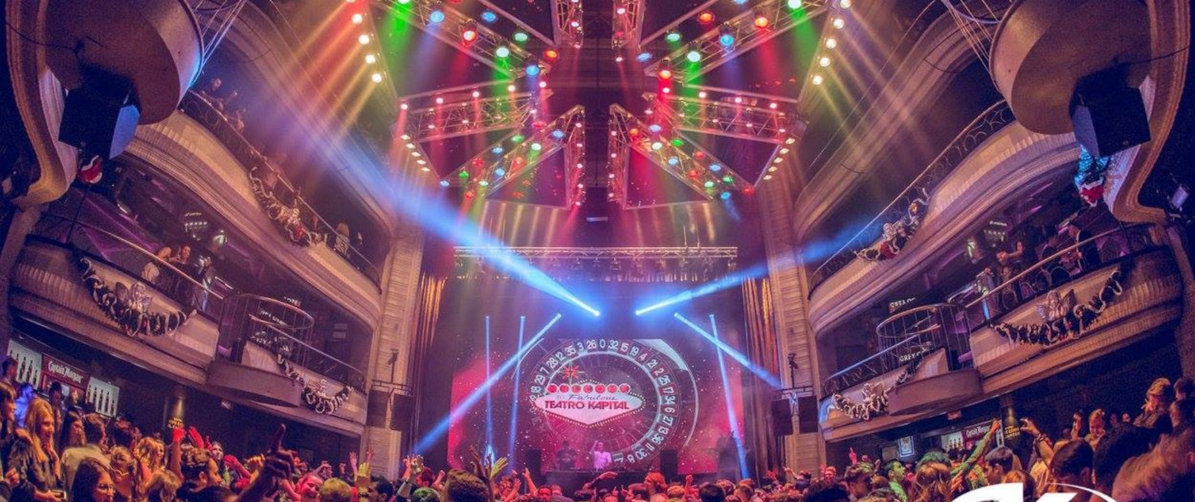 Teatro Kapital Madrid is known worldwide for its structure: the building is divided into 7 floors totally independent of each other, and in which you can enjoy totally different environments: Ground Floor: "Main Floor" - Music House and Dance. 1st floor: "The Privee" - VIP area and wardrobe. 2nd floor: "Music Studio" - Karaoke. 3rd floor: "The Box" - Funky Music and R&B. 4th floor: "Kissing Room" - Cocktail Bar and Bombay Sapphire. 5th floor: "" The Party "- Varied music. 6th floor: "Mojito and Cuba Libre Bacardi Area" - Latin Music. 7th floor: "The Terrace" - Smoking Area and Lounge Bar.
