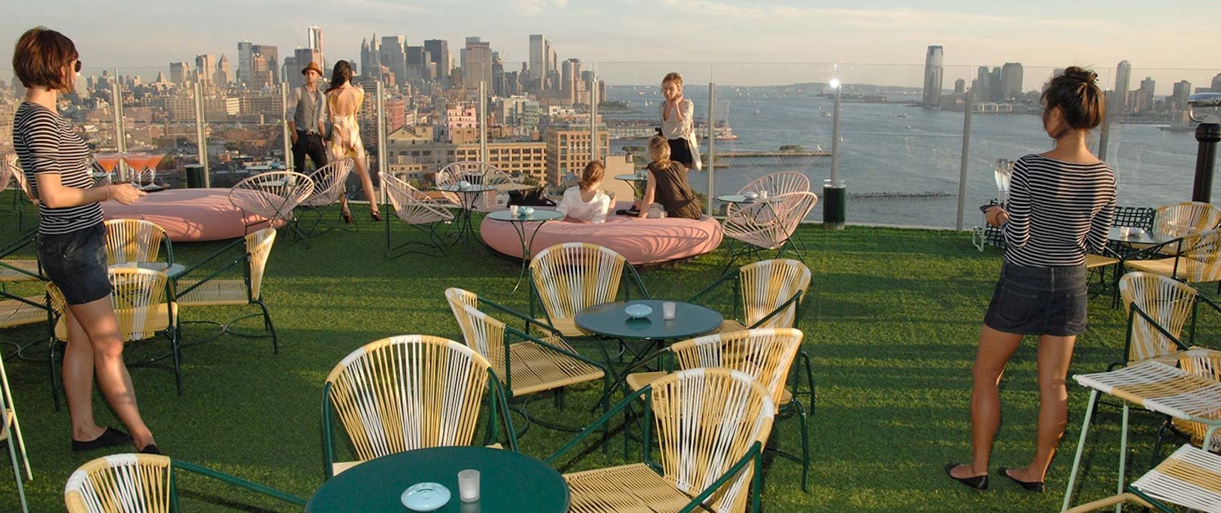 Perched high atop the roof of the Standard Hotel in the Meat Packing district, Le Bain offers party goers fantastic views, and a hip downtown crowd. In the summer, Le Bain features an indoor hot tub (complete with vending machines in the bathroom selling $80 bathing suits) and one of the most spacious rooftops in NYC nightlife (with a crepe stand, in case you get hungry.) Le Bain is also quite large by NYC standards- consequently it is usually not too difficult to gain entry during the daytime (as long as you show up early). Le Bain is an exclusive venue. Only roups of mostly females stand a good chance of getting in. = The crowd at Le bain is comprised primarily of scenesters and hip- downtown creative types. Corporate types and upscale types often frequent the venue as well, but most of the time must commit to spend a minimum at the bar. The venue is also a favorite of fashionable models and upscale sophisticated types who come from The Boom Boom Room. which is across the hall.