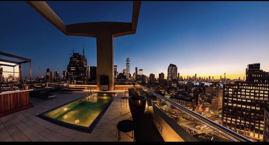 Set 18 stories high in Soho, the newly reimagined JIMMY is one of NYC's first and most beloved rooftops, and features one of the few outdoor pool decks in town. With decor inspired by Picasso's Blue period, JIMMY was created and is curated by David Rabin and Johnny Swet. The atmosphere is intimate and refined, with vintage and contemporary furniture and a working fireplace – all surrounded by 14’ windows with panoramic views of Midtown, Wall Street, the Hudson River, and the bridges spanning the East River. The music is cool and conversational-level, but heats up as the hour gets later on weekends. Unlike typical rooftop bars, JIMMY is a year-round destination. In colder months, guests gravitate towards the inside conversation pit – featuring blue and leather velvet modular furniture, sculptural stools, and an eclectic mix of tone-on-tone furniture. In warmer weather, the experience spills onto the roof deck, seamlessly going from daytime chaises to evening cocktail seating with unparalleled city views.