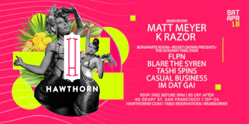The former Lot 46 location on Geary and Kearny has long sat vacant, but there’s a new taker in the form of Hawthorn, an upcoming bar, lounge and nightclub due to open on July 1st. The new spot comes from business partners Chadwick Baumbach (Kimpton Group, La Costanera) and Gabriel McWilliams. Designed as a bar and sunken late-night lounge and dance floor, the focus will be on a cocktail menu designed by Ethan Terry (Alembic, 15 Romolo), as well as a Void Tri-motion sound system that’s billed as the first of its kind in North America. Terry will seek to escape the general mediocrity of club cocktails with a menu of seven cocktails that follow the artisanal bent of the city’s elevated cocktail scene. Though the full drink menu isn’t yet available, we do know there’ll be a Midori Sour variant called the “Mucho Melon Sour,” (vodka, fresh cantaloupe, house-made jalapeño juice, lemon, Chareau Aloe liqueur and egg white). Also on the team are Nate Mezmer (EyeHeartSF), who will be in charge of booking musical talent, and Jenny Kiely (Mars Bar), who’ll manage front-of-house affairs. The interior design comes from Joshua Rowland Design Team, and aims for a a warm and sultry feel, with Austrian drapes and lavender ceiling swathes in addition to low lounge-style seating. At present, it’s not clear whether Lot 46’s treacherous set of stairs will remain to challenge future inebriates.