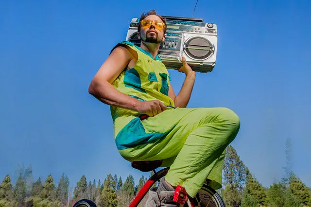 In alignment with TPA’s artistic ethos is a low-key lifestyle that places a premium on being present, living in harmony with nature, participating in community and inspiring it to thrive. Offstage, David Sugalski instigated a village-building convergence in his hometown in Northern California, and manages his own 25-acre homestead in the picture-Esque, rolling Sierra Nevada foothills. The farmer/carpenter lives modestly in a cabin he built on his land of the lush; TPA music is created in a solar-powered recording studio on the property. When he removes the famed bright blue-and-yellow 80’s jumpsuit and reverts back to his humanoid self, Sugalski is an avid solo bicyclist who enjoys venturing up California’s breathtaking coastal Highway 1; he’s a dedicated van-adventurer, having built out an exquisite tiny home inside a contractors van.