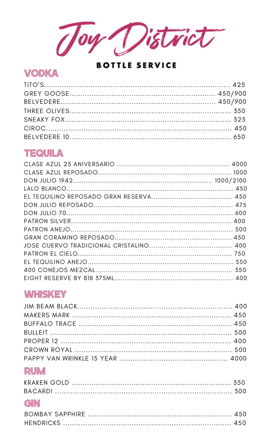 Keep in mind that bottle menus at Joy District are subject to change. Special events and holidays may also have different menus available.