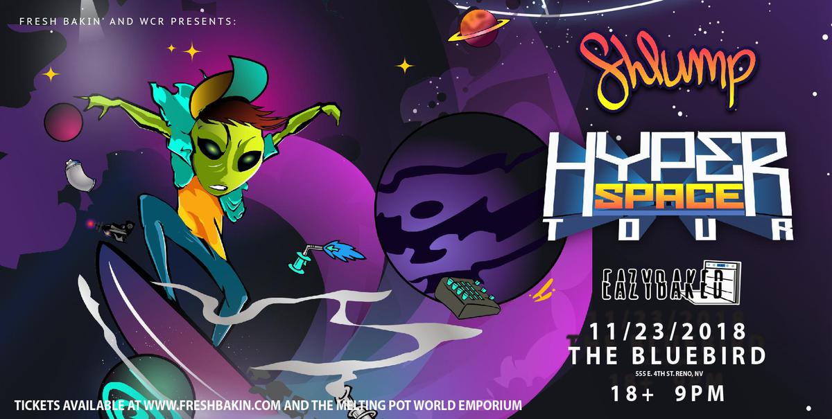 Shlump returns to Reno on his Hyperspace Tour with special guest Eazybaked on November 23rd at The Bluebird. Fresh Bakin' and West Coast Ravers present the return of Shlump on November 23rd to The Bluebird in Reno. Local support TBA. 18+ / 9pm