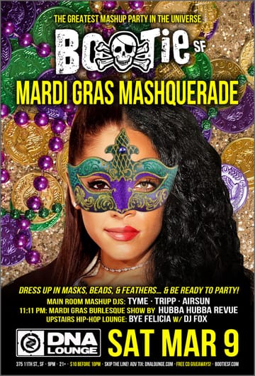 Mardi Gras is a decadent celebration, filled with dancing and partying all night long -- in other words, Saturday night at Bootie SF! Dress up in masks, beads, and feathers, and be ready to party as Bootie's mashup DJs toss beads and keep the mashquerade going late into the night.► $10 entry all night in a Mardi Gras mask or full Mardi Gras costume► Or $10 before 11 PM with Facebook RSVP (click going before 7PM, Sat Mar 9)► Early Bird Drink Special: $7 cocktails until 10 PM► FREE Bootie Mashup CD giveaways throughout the night!Spinning the best mashups in the world ever, Bootie Mashup was launched in San Francisco in 2003, shamelessly mixing and matching pop songs both throwback and current. With its creative theme parties and clever mashup formula, Bootie Mashup has been winning numerous nightlife awards in multiple cities for over 15 years. Its fun, danceable song combinations are the soundtrack for the A.D.D. generation.