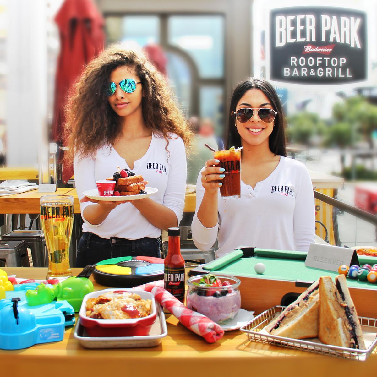 Glassed-in rooftop grill serving beer-based eats at communal tables with TV sports, views & DJs.