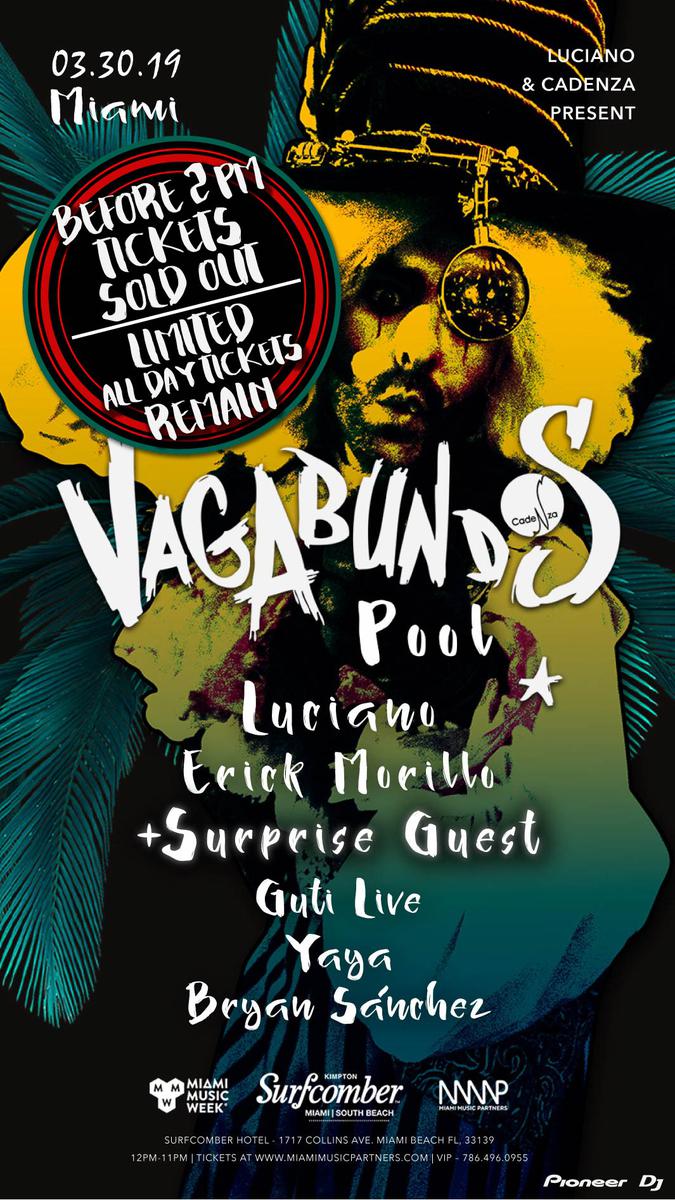 Miami Music Pool Parties 2019, at The Kimpton Surfcomber Hotel. Vagabundos Pool Artist Lineup: + LUCIANO + ERICK MORILLO + SURPRISE GUEST + Guti (live) + Yaya .+ Bryan Sanchez TICKETS ON SALE NOW! www.miamimusicpartners.com