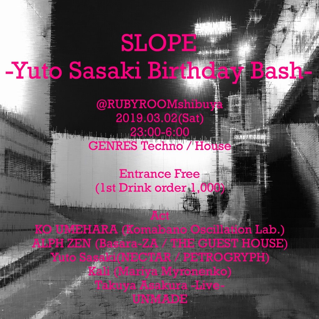 SLOPE -Yuto Sasaki Birthday Bash- @RUBYROOMshibuya 2019.03.02(Sat) 23:00-6:00 GENRES Techno / House Entrance Free (1st Drink order 1,000)