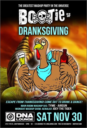 Escape from Thanksgiving! Come on out to Bootie SF to drink and dance! Shake off those extra calories and turkey day stress, as resident DJs Tyme and Airsun throw down the greatest mashups in the world.►► NOW 18+ ◄◄★ Only $10 before 11 PM with Facebook RSVP (click going before 7PM, Sat Nov 30) ★► FREE Bootie Mashup CD giveaways throughout the night!Spinning the best mashups in the world ever, Bootie Mashup was launched in San Francisco in 2003, shamelessly mixing and matching pop songs both throwback and current. With our creative theme parties and clever mashup formula, Bootie Mashup has been winning numerous nightlife awards in multiple cities for over 16 years. Our fun, danceable song combinations are the soundtrack for the A.D.D. generation.