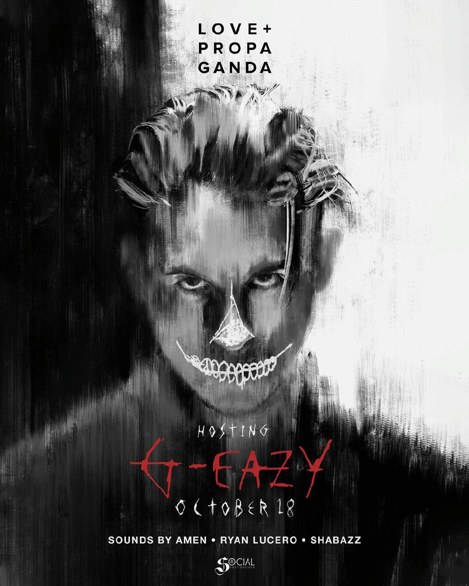 FOR TABLE SERVICEGlobal super star, G-Eazy, hosts and performs at Love + Propaganda on October 18th for his Scary Nights EP release party.