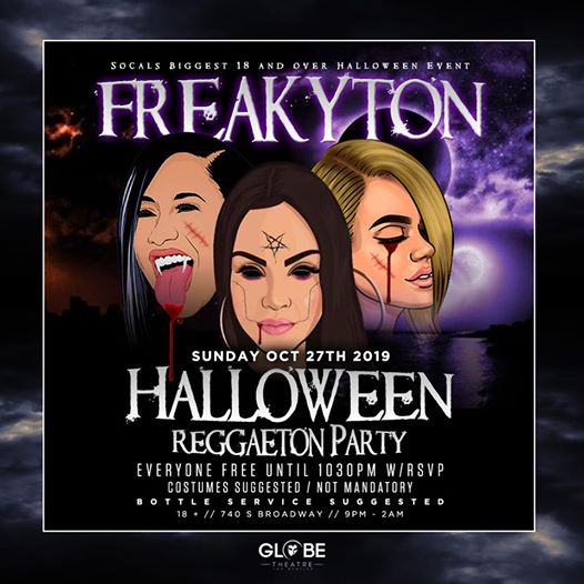 Halloween Weekend, prepare for a night of Puro Perreooooo!!!Bailando Reggaeton brings out the FREAK in all of us!!Get ready for a crazy night!!!***** FREAKYTON ****Reggaeton + Trap / Hip HopHalloween Party**** The GLOBE Theatre ****Sunday October 27th, 201910pm - 2am18+ Valid ID is NeccessaryCostumes are Highly Suggested / Not MandatoryBottle Service is Available / Text 310.651.0599 for infoIts going to be a night of pure DESMADRE!! Come dressed in your best costumes and dance the night away with SoCals biggest Reggaeton Freaks as we ROMPE la Discoteca!!!Step inside the marvelous GLOBE Theatre for a scary good time! Fully decorated with 1000+ capacity, a mezzanine level and state of the art sound and production system!Dont miss out!!