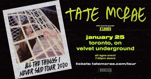 Embrace Presents TATE MCRAE W/ X LOVERS Doors: 7:30pm All ages event Pre-sale: Thursday, October 24 @ 10am - PW: TEAR Public on sale: Friday, October 25 @ 10am TATE MCRAE https://twitter.com/tatemcrae https://www.facebook.com/TateMcRaeOfficial/ https://www.instagram.com/tatemcrae/ X LOVERS https://www.facebook.com/XLoversMusic/ https://twitter.com/xlovers https://www.instagram.com/xlovers/
