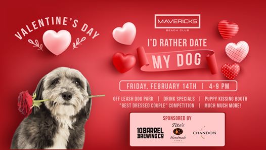 Back by popular demand, this Valentines Day, Friday February 14th, come enjoy drink specials from Chandon, Tito's and 10 Barrel and spend the most romantic day of the year snapping photos in our Doggy Photo Booth, competing for “Best Dressed couple”, playing in our off-leash Dog Park and wining and dining your Canine Compadre at Mavericks! ❤️🐶
