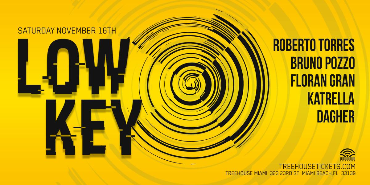 Low Key @ Treehouse Miami Saturday, November 16th Low Key Roberto Torres Bruno Pozzo Floran Gran Katrella Dagher Doors open at 11pm