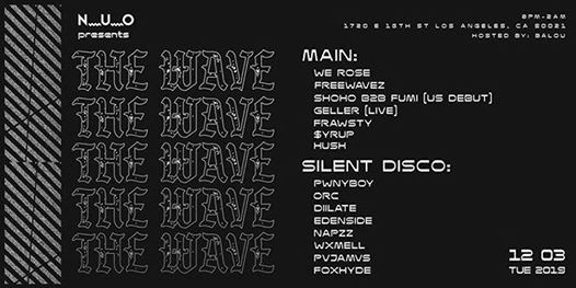 N_U_O SOUND PRESENTS "THE WAVE" Tokyo based bass music & party creators N_U_O Sound bring you a night with fresh and upcoming talent. Tuesday, December 3rd Ages: 19+ Doors Open: 08:00PM MAIN: WE ROSE | SHOHO B2B FUMI | FREEWAVEZ | GELLER | FRAWSTY | $YRUP | HUSH HOSTED BY: BALOU SILENT DISCO: PWNYBOY | PVJAMAS | NAPZZ | WXMELL | FOXHYDE | EDENSIDE | ORC | DIILATE TICKETS AVAILABLE HERE: https://www.etix.com/ticket/p/2146007/nuo-sound-presents-the-wave-los-angeles-1720?fbclid=IwAR3IgTUDVs9nScObxZjp9mkmZpje4hVcJmLGb50zCzNXcoA15mAyBo2u4aU