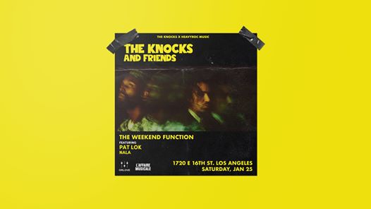L'Affaire Musicale , Orlove, & 1720 Present The Knocks and Friends The Knocks Pat Lok This is NALA Saturday, January 25th, 2020 1720: 1720 E. 16th St., DTLA Doors: 9PM // 9PM-2AM // 18+ For more information, email orlove@orloveentertainment.com