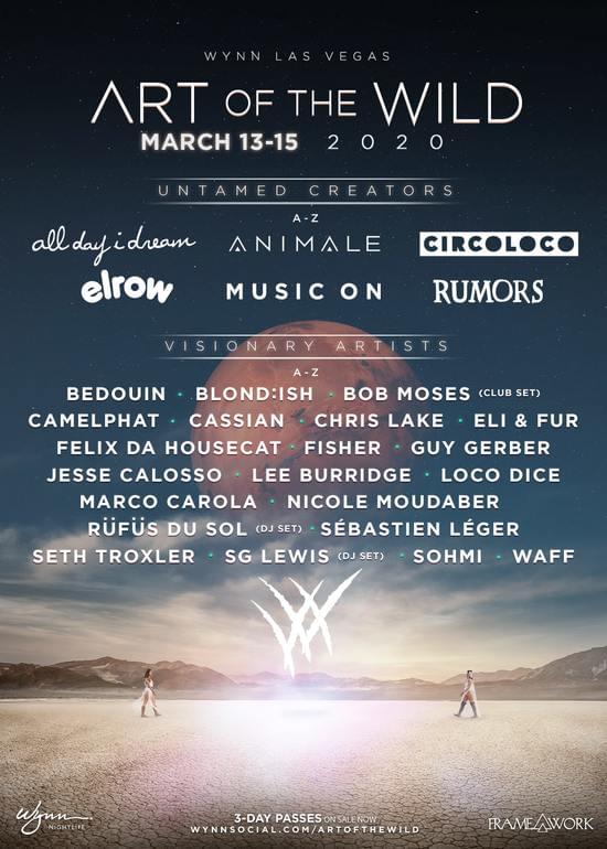 Wynn Nightlife along with promotional partner, Framework, have teamed up again to present an unrivaled lineup of talent for the fourth installment of Art of The Wild, including: Bedouin, Blondish, Bob Moses, Chris Lake, Felix da Housecat, Fisher, Guy Gerber, Lee Burridge, Loco Dice, Marco Carola, Rufus du Sol, Seth Troxler + more to be announced