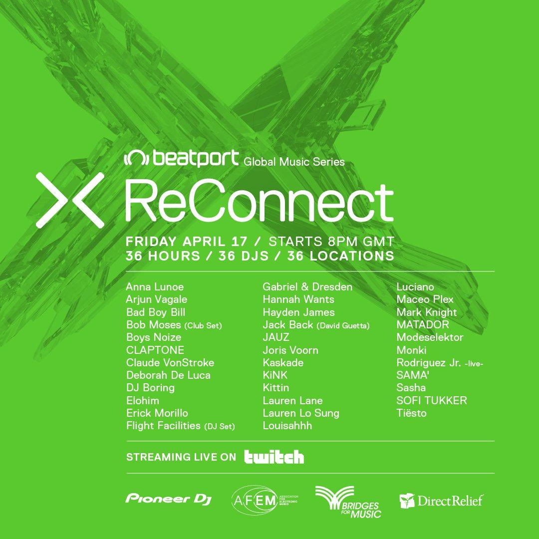 Beatport‘s ReConnect is going for round two this weekend! The second installment of the live stream music marathon goes down this Friday April 17, starting at 8 PM GMT and runs for 36 hours straight. The talent is top notch, featuring Tiësto, Kaskade, Jack Back (David Guetta), Deborah De Luca, Boys Noize, Anna Lunoe, Jauz and many more.