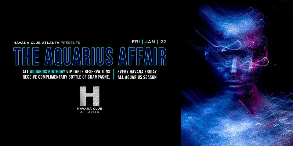 This Friday, Jan. 22nd, Havana Fridays Presents: The Aquarius Affair Party! All Aquarius birthday VIP table reservations receive a complimentary bottle of champagne each & every Friday ALL Aquarius season long!
