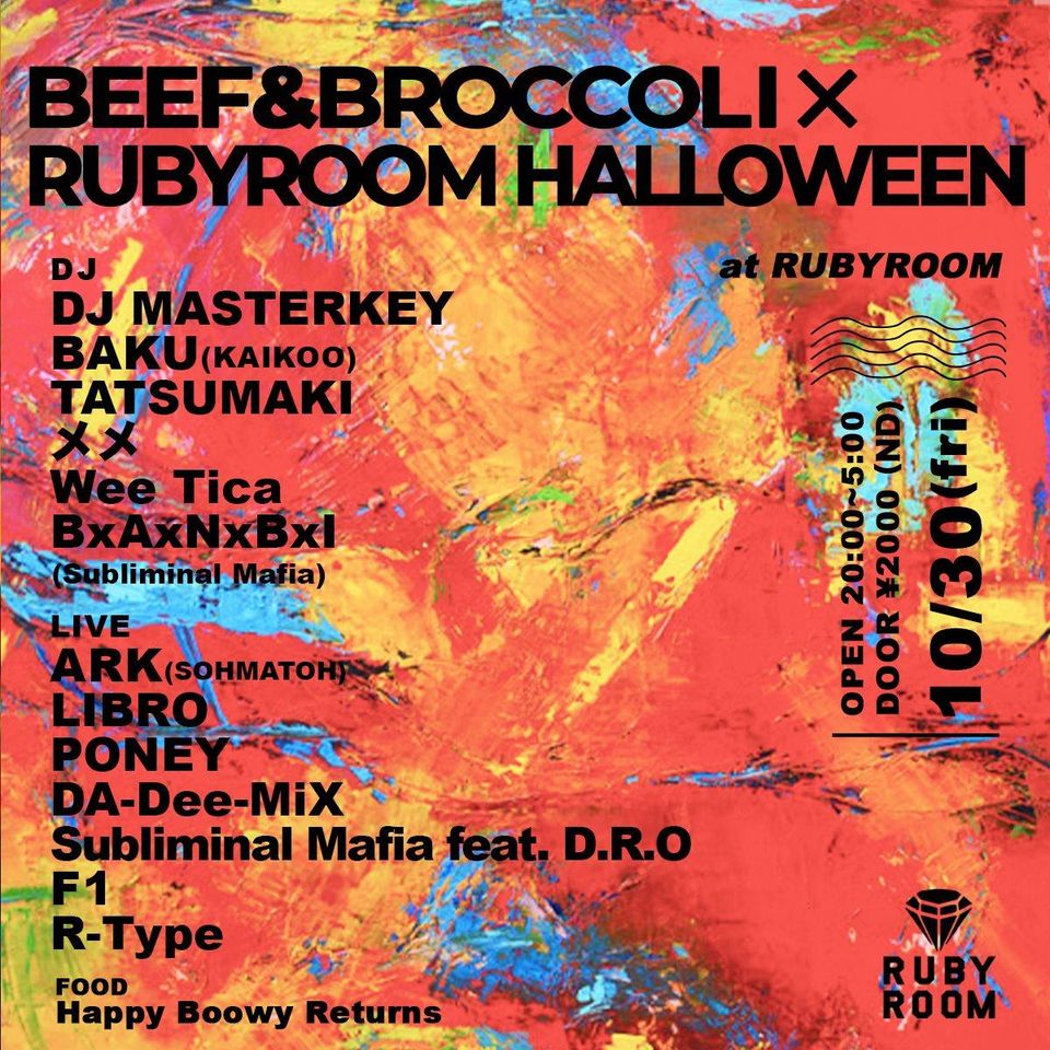 10/30( fri) BEEF&BROCCOLI✖️RUBYROOM HALLOWEEN OPEN 20:00-5:00 DOOR ¥2000(ND) ▶︎DJ MASTERKEY BAKU(KAIKOO) TATSUMAKI メメ Wee Tica BxAxNxBxI(Subliminal Mafia) ▶︎LIVE ARK(SOHMATOH) LIBRO PONEY DA-Dee-MiX Subliminal Mafia feat. D.R.O F1 R-Type ▶︎FOOD Happy Boowy Returns