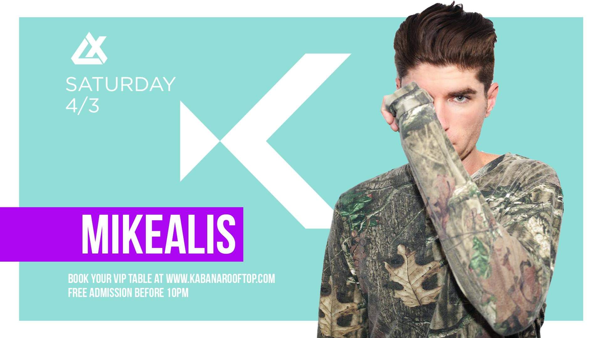 Kabana Saturdays Mikealis Doors open at 9PM VIP Table Reservations at www.kabanarooftop.com Free Before 10PM Hosted by LXGRP