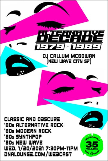 Obscure 80s alternative rock, 80s modern rock, 80s synthpop and 80s new wave, live from the DNA Lounge Main Room!