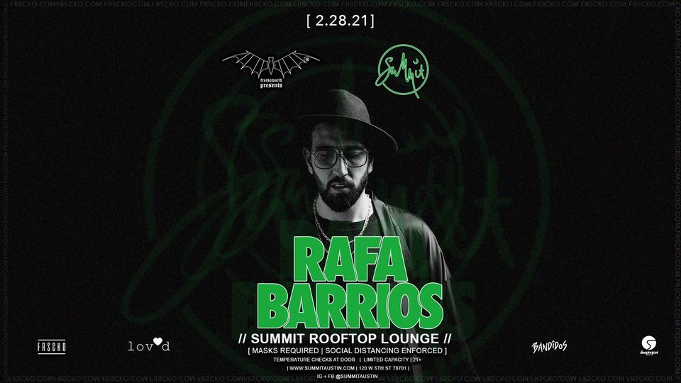 FRSCKOWORLDPresents// RAFA BARRIOS SANTIAGO RAFA BARRIOS [ MASKS REQUIRED | SOCIAL DISTANCING ENFORCED ] TABLE INFO 702-743 -7051 LIMITED CAPACITY 21+ WWW.SUMMITAUSTIN.COM 120 W 5TH ST 78701