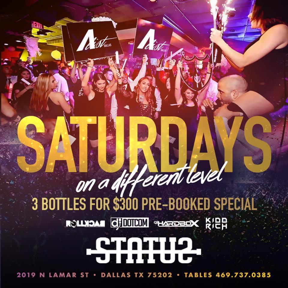 Sold Out Saturdays at STATUS Downtown hosted by: AList Dallas. “What’s your Status?” Join us every Saturday night at Status Dowtown Dallas for our premier weekly Saturday night party. 3 Rooms 3 Vibes & Multiple DJs