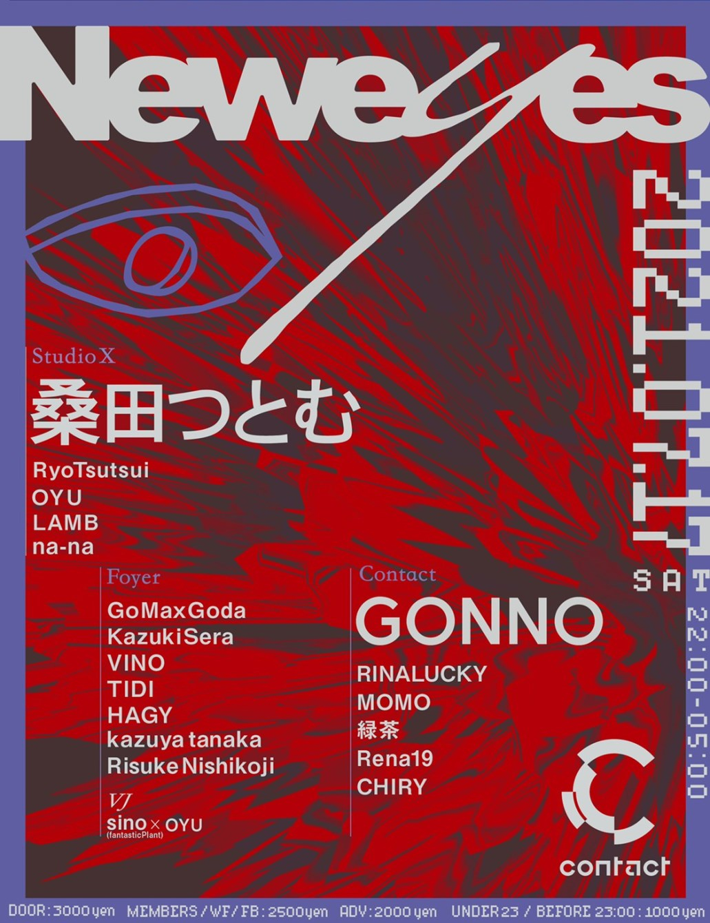 2021年世界は未曾有の危機を乗り越えるために試行錯誤を繰り返している、人々がユートピアに辿り着くために新しい実験が始まる「Neweyes」新しい視点から本来あるべきダンスミュージック、パーティの再構築を図る。第一回目のゲストには桑田つとむ、Gonnoとキャリアに裏打ちされた両雄がそれぞれのフロアーで独自の音楽を披露する。Neweyesから始まるダンスミュージックを五感で感じ取ってほしい。