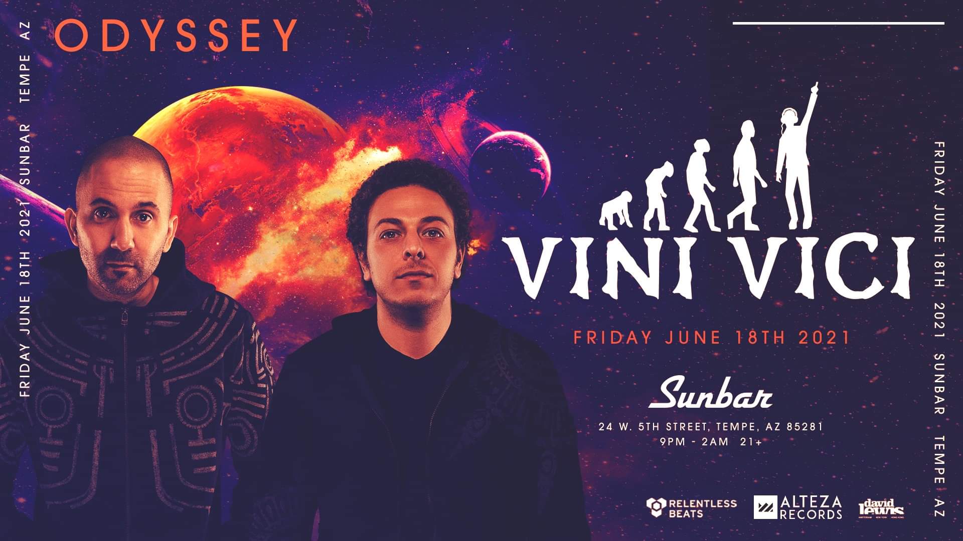 Voyagers! Join us on our next Odyssey as Vini Vici makes their long-awaited Arizona debut on Friday June 18 at Sunbar ☄ Tickets on sale now at http://rb.ht/ViniVici21 For table service reservations and pricing, please call (480) 408-5010