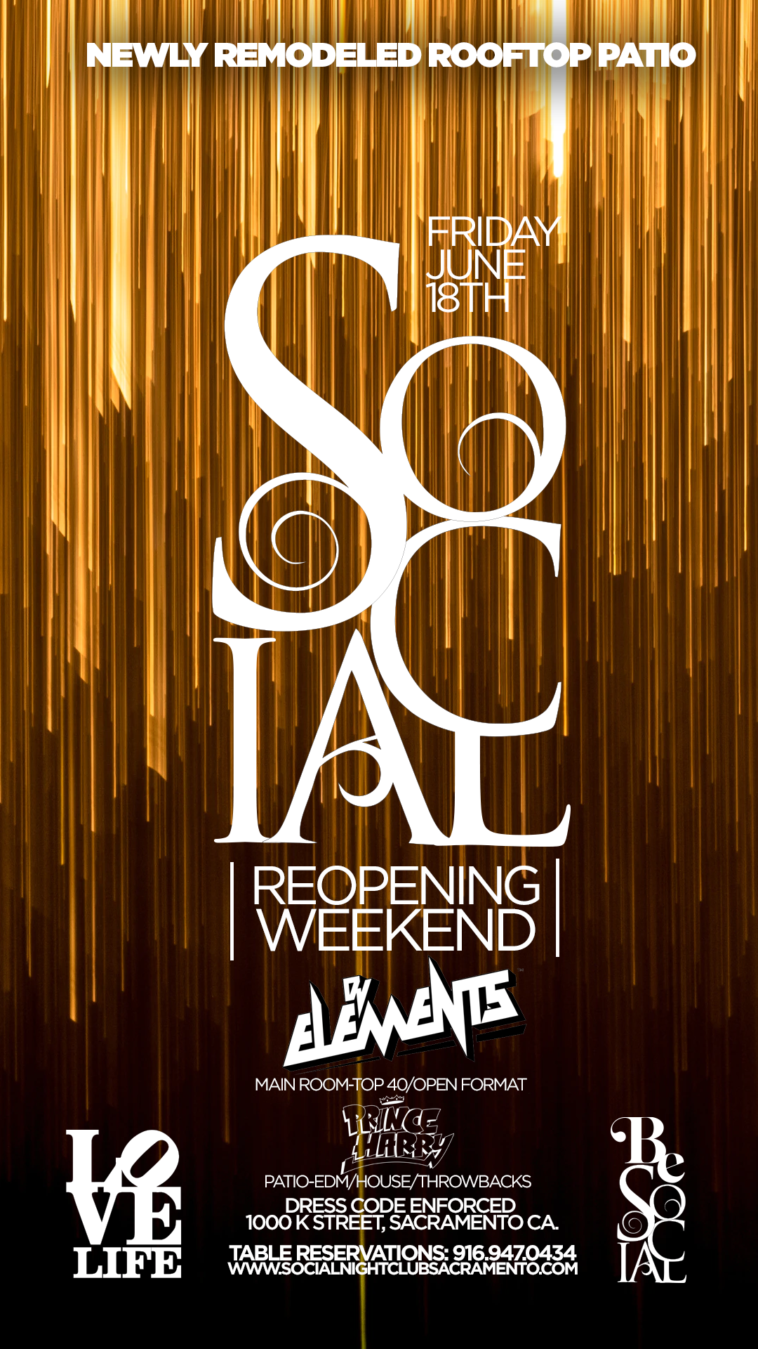 Friday, June 18th Social Nightclub returns with a fresh new look and sounds by Sacramento Kings Dj Elements and Prince Harry. Limited capacity