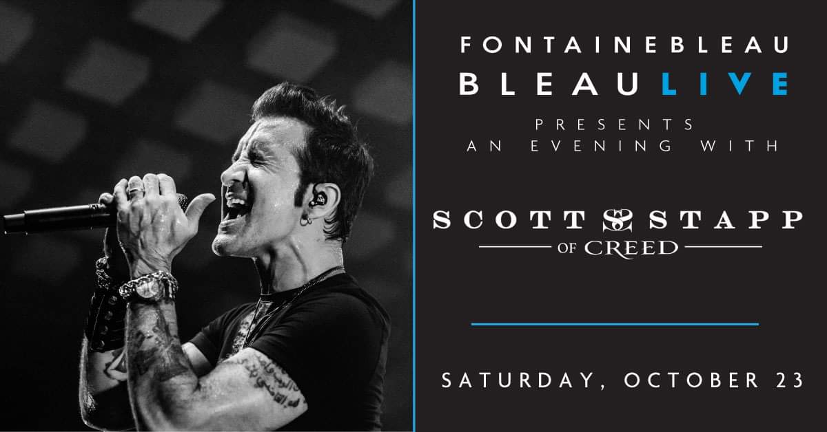 This Fall, Fontainebleau Miami Beach presents Scott Stapp, adding one of rock's most distinctive voices to its repertoire of legendary BleauLive acts. On Saturday, October 23, Creed frontman will take the BleauLive stage to fill LIV with his rock hits, such as "Purpose for Pain," "Survivor" and "The Great Divide."