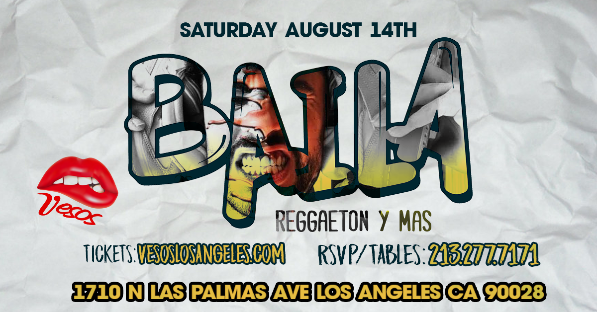 Vesos brings you BAILA Hollywood August 14th 21+ At the newest and hottest venue! All white leather interior, 2 floors with its own personal bar, amazing lighting and a sound system that will have you dancing all night. This night is going to be on another level!