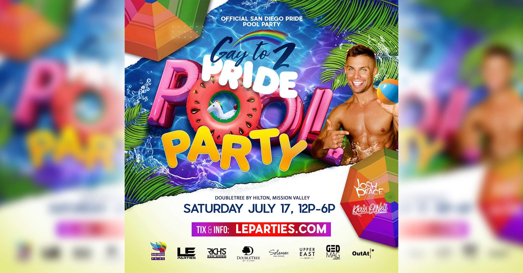 GAY to Z SATURDAY PRIDE POOL PARTY for San Diego Pride 2021 at the DoubleTree by Hilton, Mission Valley Pool! This year Saturday is expected to reach Sell-Out capacity, and with PRIDE beats by JOSH PEACE and KHRIS O'NEIL, you know the place will be LIT! All-new decor, production, and full bars for PRIDE SAN DIEGO!
