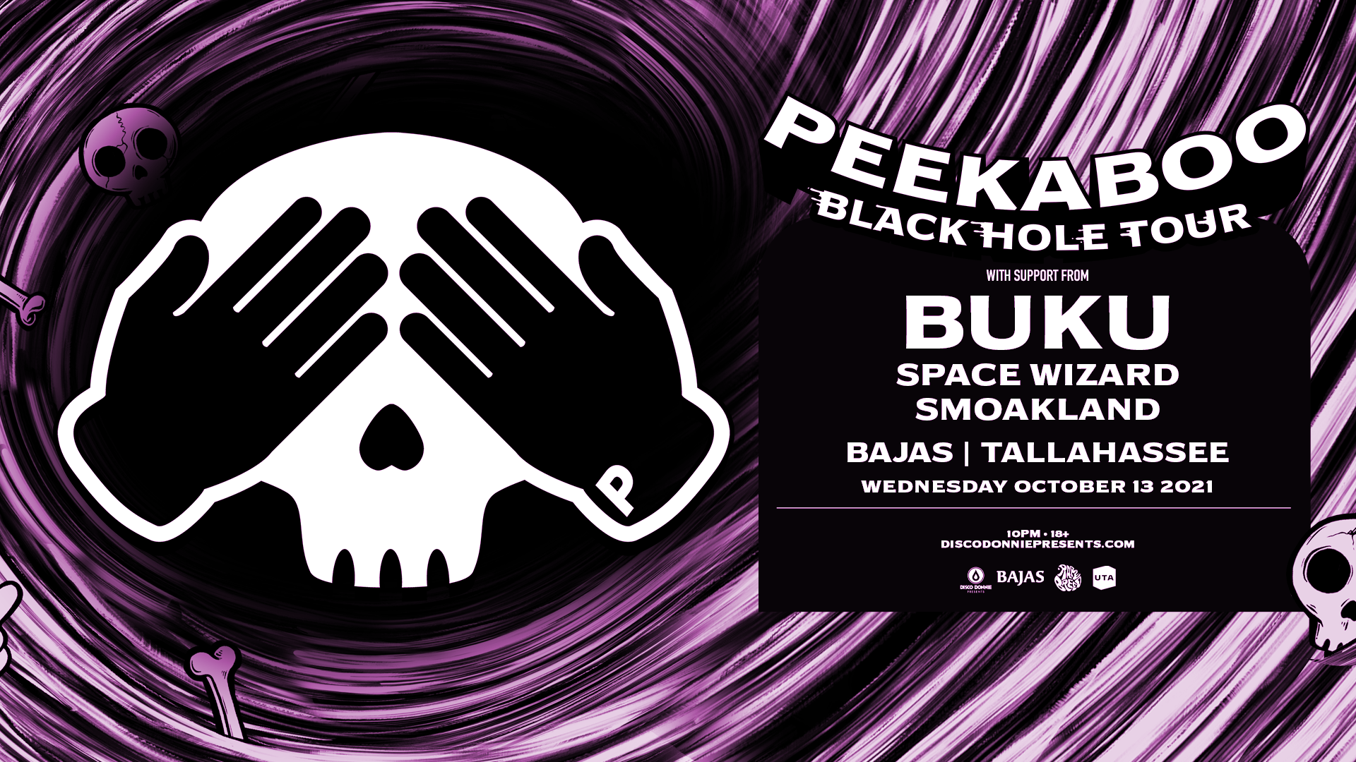THE SHOW WE HAVE BEEN WAITING FOR! Peekaboo: Black Hole Tour at Bajas Wednesday October 13th feat Peekaboo Buku, Space Wizard and Smoakland! Buy your tickets now! This Event will Sell Out! VIP Tables here: 18 To Enter - 21 To Drink