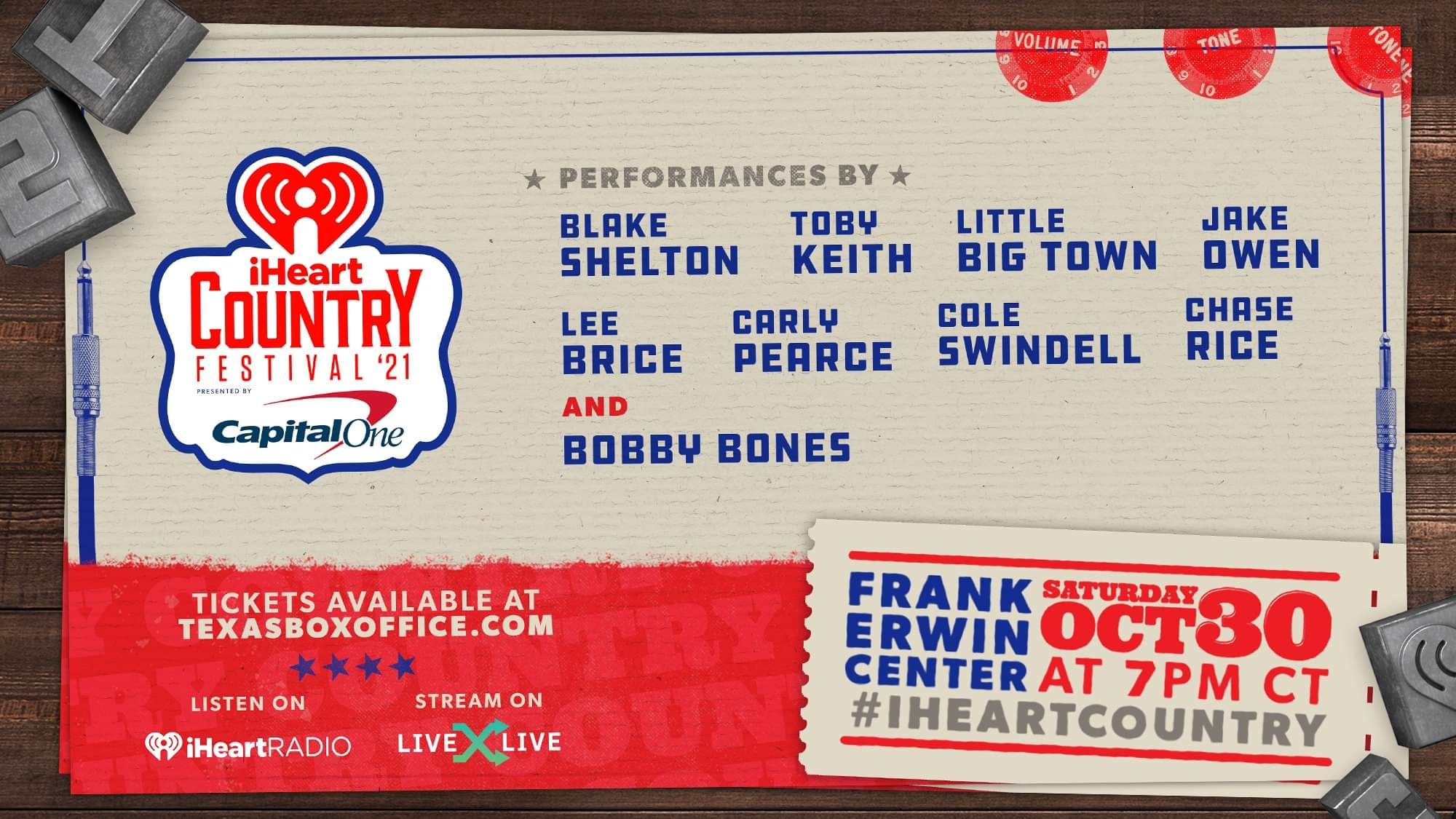 iHeartCountry Festival Presented by Capital One returns to the Frank Erwin Center on Saturday, October 30! Now in its eighth year, the 2021 lineup will feature Country music’s hottest artists including Blake Shelton, Toby Keith, Little Big Town, Jake Owen, Lee Brice, Carly Pearce, Cole Swindell and Chase Rice performing live at the Frank Erwin Center in Austin hosted once again by iHeartMedia's nationally-syndicated top on-air Country personality, Bobby Bones.