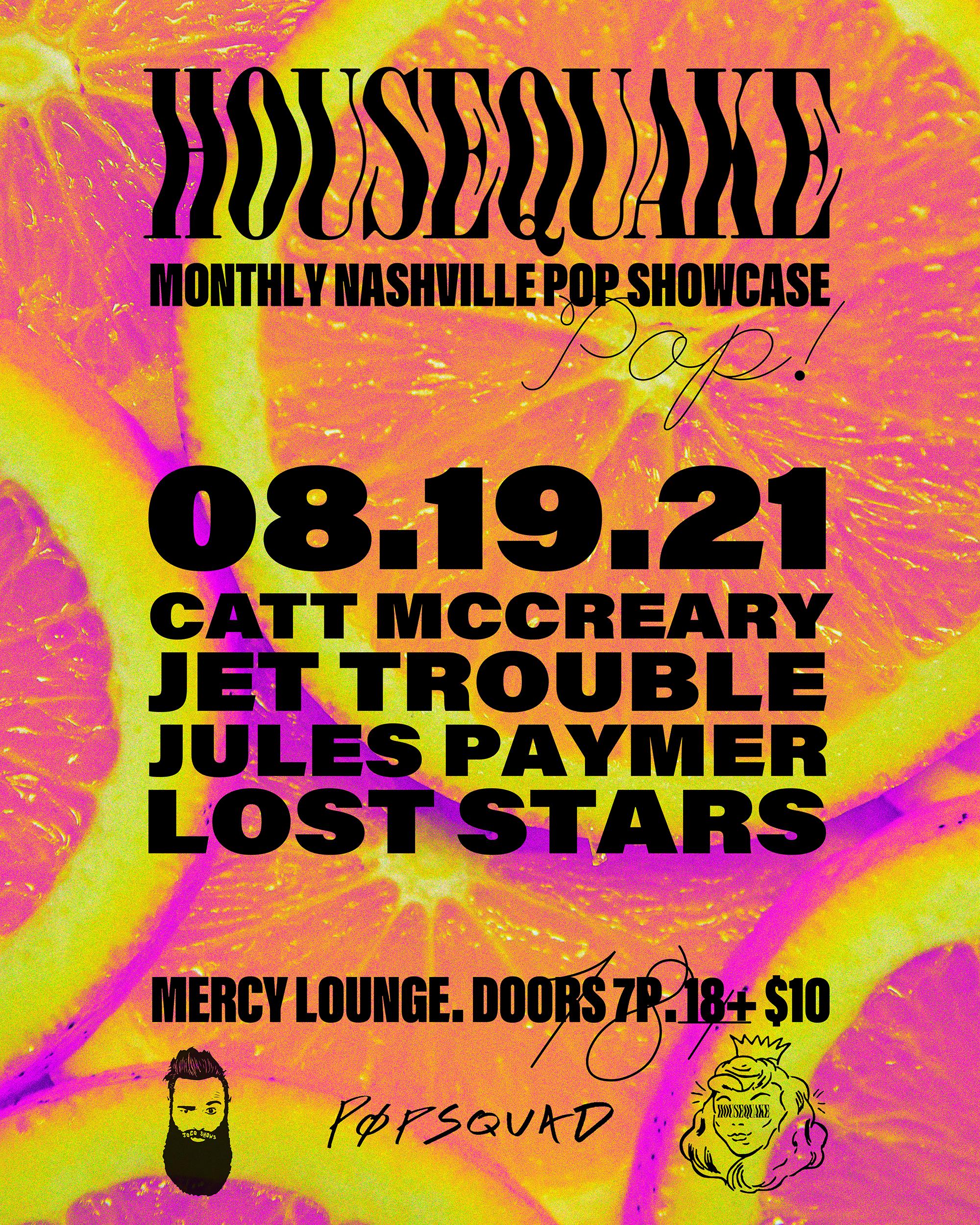 HOUSEQUAKE: August 2021 Edition at Mercy Lounge Nashville's premiere monthly pop showcase, back and better than ever! Performances by Catt McCreary, Jet Trouble, Jules Paymer, and Lost Stars VALID GOV'T ISSUED PHOTO ID REQUIRED - NO EXCEPTIONS