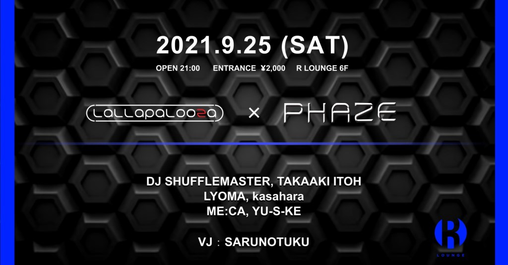 大田区・京浜島の鉄工所跡地「BUCKLE KOBO」などで開催されてきたテクノフェスLALLAPALOOZAとR LOUNGEで開催されているテクノ、ハウスパーティPHAZEが昨年に続きコラボレーションパーティーを開催。 1990年代中頃からベルリンの名門レーベルTresorを筆頭に、自身のHousedust、Ben SimsのTheory、Subvoice等からのリリースや、Adam BeyerのCODE RED、Thomas Shumacher、DJ RUSH、DJ DEEON等へのリミックスワークをこなし、先鋭的なミニマルテクノ作品をリリースしてきたSHUFFLEMASTER、これまでに50を超えるトラック, EPをリリースと並行して世界二十カ国以上の200を超える都市でプレイのキャリアを持つジャパニーズ・アンダーグラウンドテクノキングことTAKAAKI ITOH、1998年からの9年間をベルリンで過ごし、ドイツ、ポーランド、イギリス等の様々なベニューで研鑽を積み、2011年からは自身のレーベルabend kollektivを展開するLYOMA、都内を中心に様々なパーティや野外フェスなどで活躍するkasahara、そしてLALLAPALOOZA主宰のYU-S-KE、ME:CAが登場する! 当日はLALLAPALOOZAの数量限定オリジナルグッズの販売も行う。