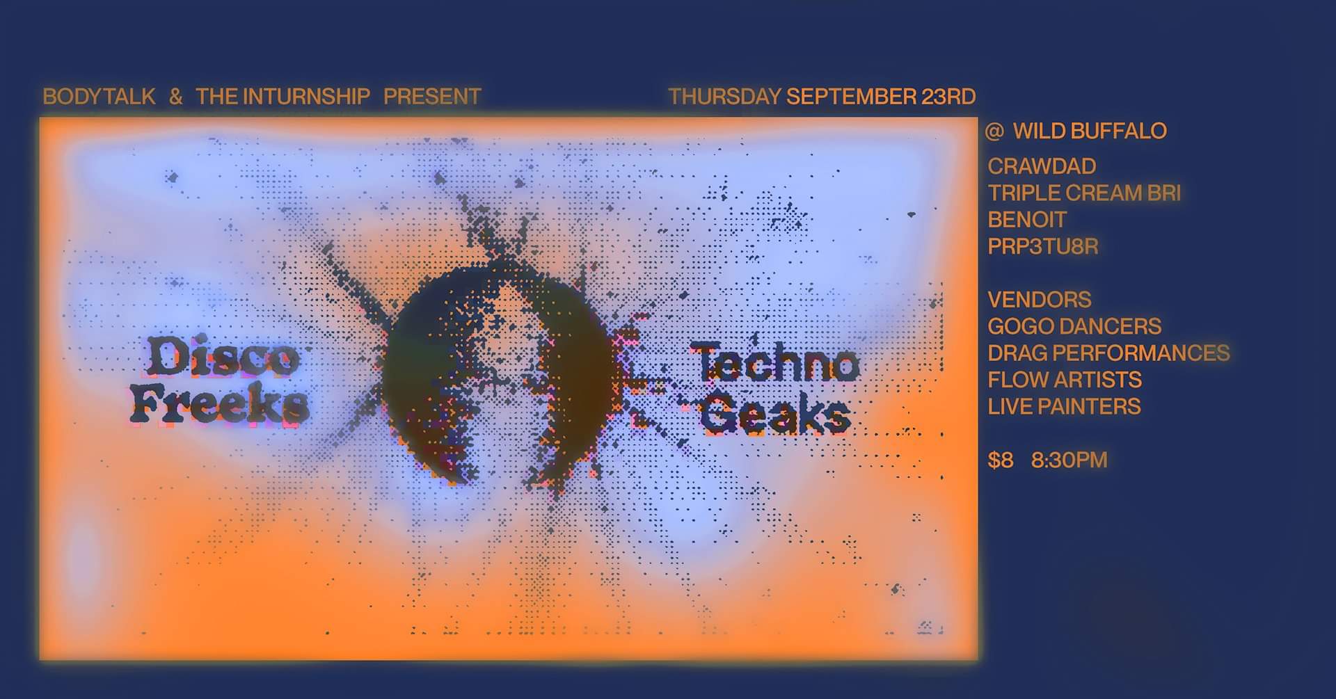 All you extravagant nightclub-goers, Bodytalk & The Inturnship present: Disco Freeks & Techno Geaks. Our selectors will be providing those scrumptious four-on-the-floor beats that swept the dance floors of the 1970s, but with a splash of that new-age techno sound. So pull out those bell-bottoms, dust off those blue-suede shoes & come get groovy with us at the Wild-Buffalo!