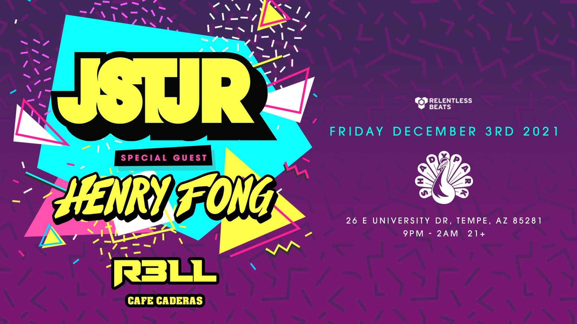JSTJR and Henry Fong are throwing a massive party Friday, December 3 at Shady Park 🍾 Drop what you're doing and get your tix now! Support by: R3LL CAFE CADERAS 🎟️ rb.ht/JSTJR21
