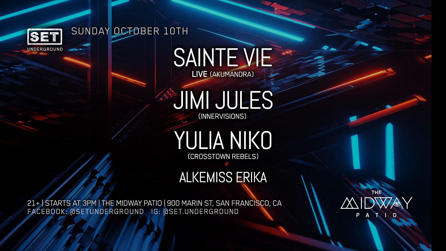 Sunday, October 10th, 2021 @ 3 PM PST Permisson to Land on the Patio Set Underground & The Midway present: SET w/ Sainte Vie Live (Mayan Warrior/Akumandra) + Jimi Jules (Innervisions) + Yulia Niko (Crosstown Rebels) + support from Alkemiss Erika 21+