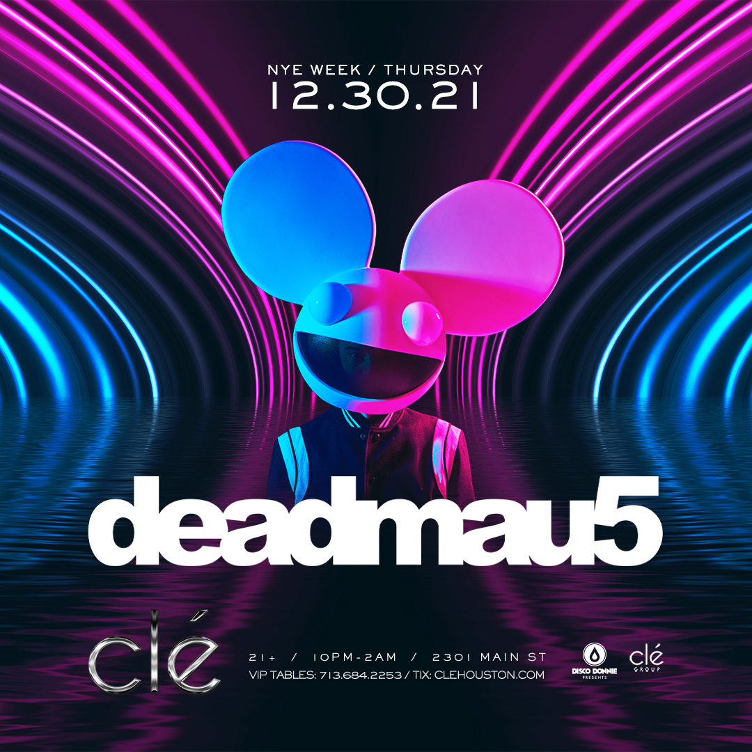 Disco Donnie Presents & Clé Group bring you: DEADMAU5 Thursday December 30th, 202110pm-2am 2301 Main StreetMidtown Houston 21+ OnlyDress Code: CasualTable Reservations: https://cletix.cc/VIP