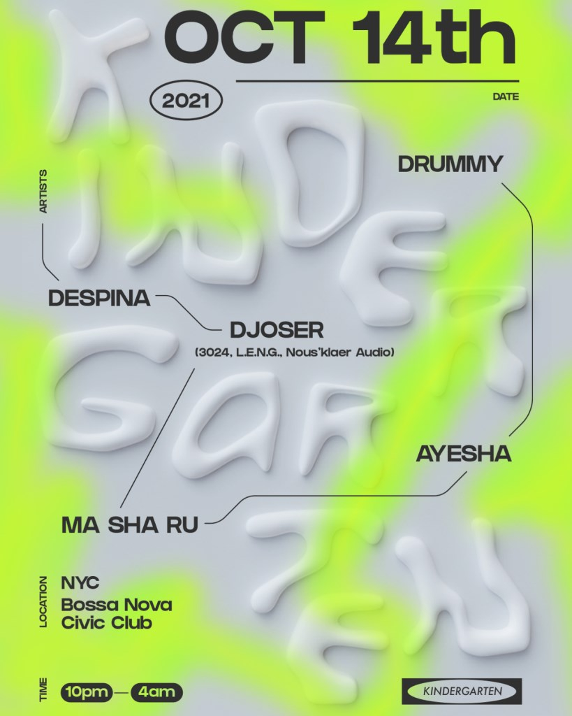 This time we are excited to welcome DC-based, Egyptian-born producer Djoser delivering rhythmic head-spinning club sounds alongside Kindergarten residents: Ma Sha Ru, Ayesha, Despina and Drummy. 6 hours of wild and enthusiastic wrong-footed rhythms.