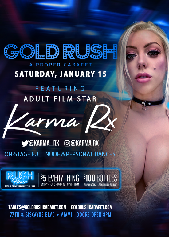 Adult superstar Karma Rx is coming to Gold Rush on Saturday, January 15. Come meet, greet and hang with your favorite adult star. Sounds by DJ Tone Rock, Miami's most beautiful female entertainers & the city's sexiest vibe. Party with $100 E11EVEN Vodka bottles and $5 food and drink specials till 11pm, delicious food all night and Miami's most beautiful female entertainers.