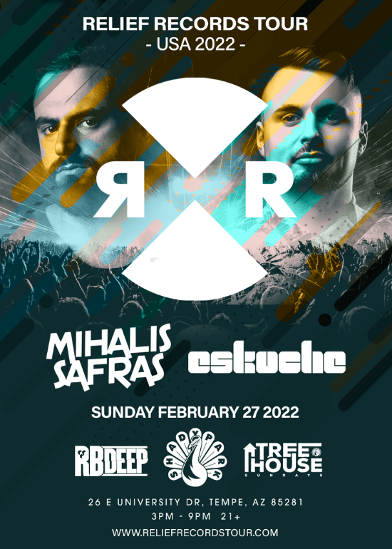 Relentless Beats presents Relief Records Tour: Mihalis Safras + Eskuche | Tempe on Sunday, February 27, 2022 at Shady Park in Tempe, AZ. This show is 21+.