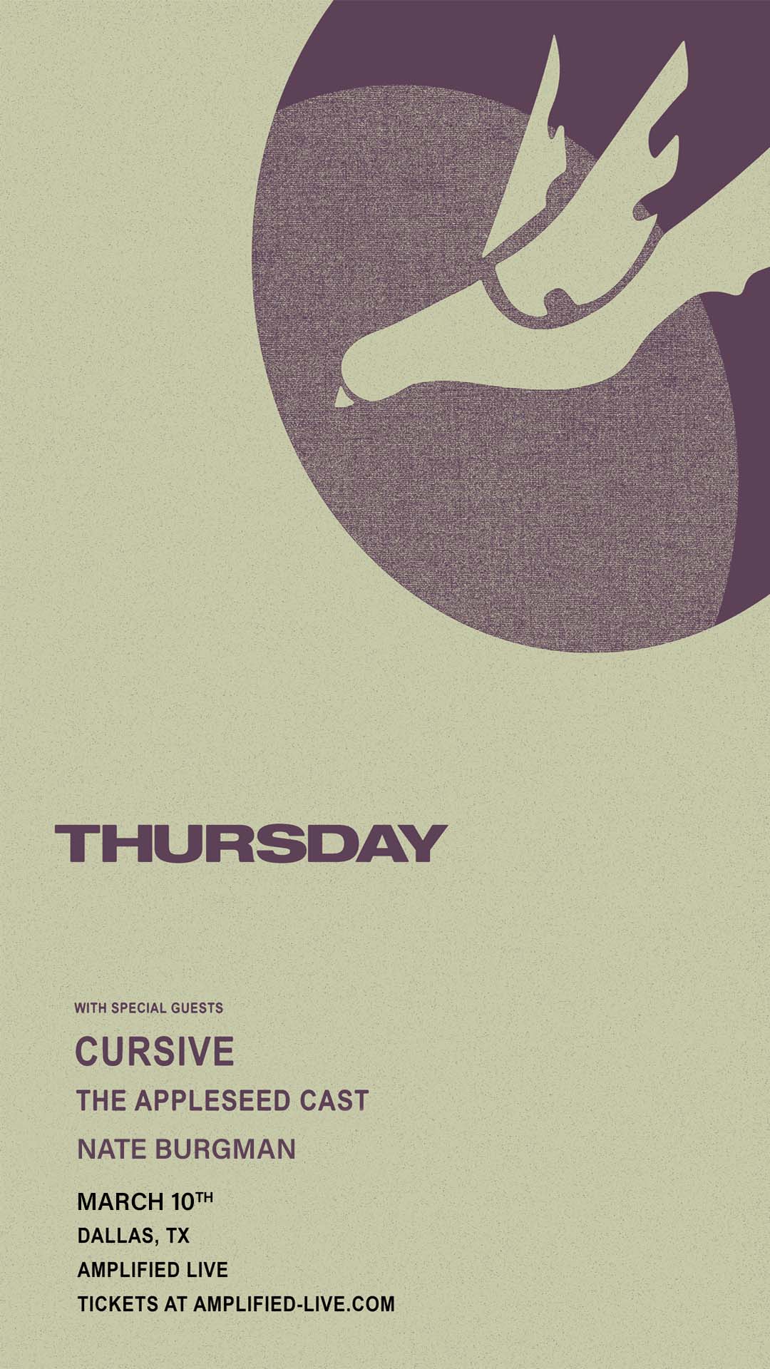 Amplified Live Presents Thursday with Cursive Appleseed Cast Nate Bergman March 10th, 2022 All Ages Doors 6 pm Show 7 pm