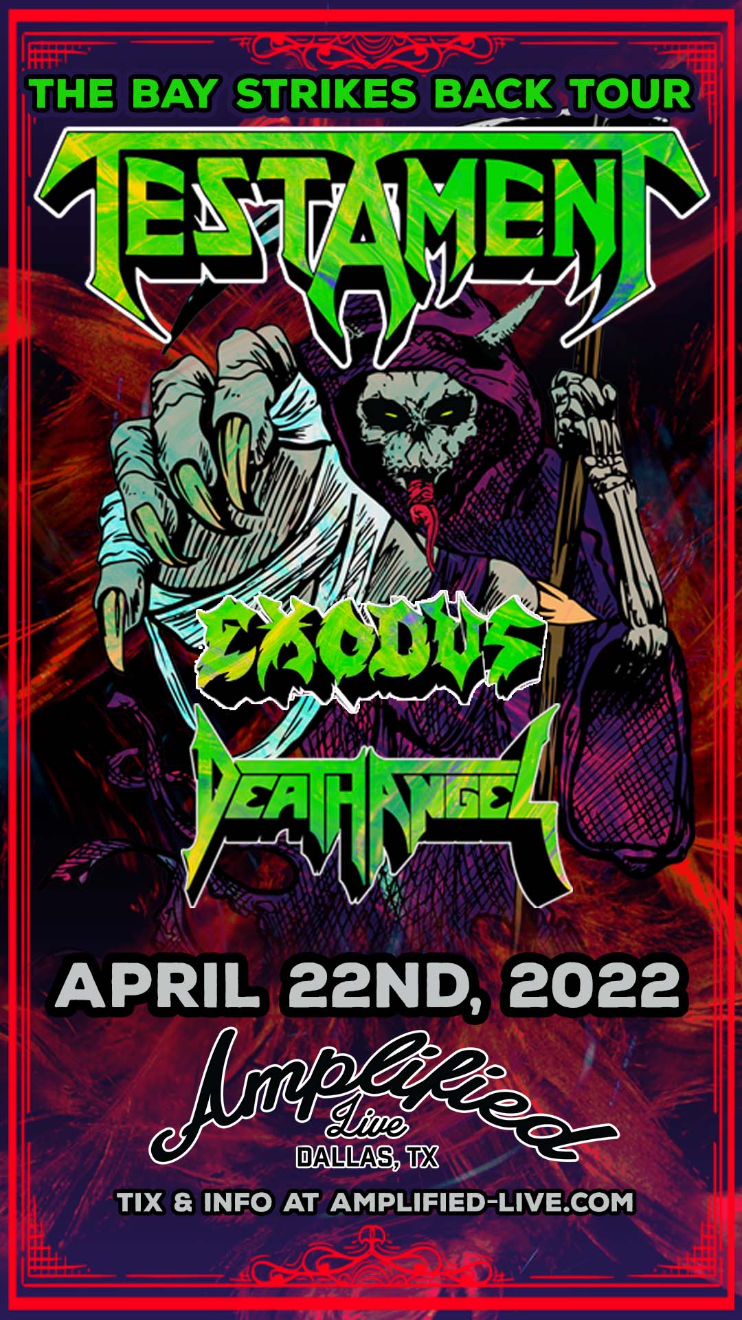 Amplified Live Presents Testament The Bay Strikes Back Tour with Exodus Death Angel April 22nd, 2022 All Ages Doors 6 pm Show 6:50 pm
