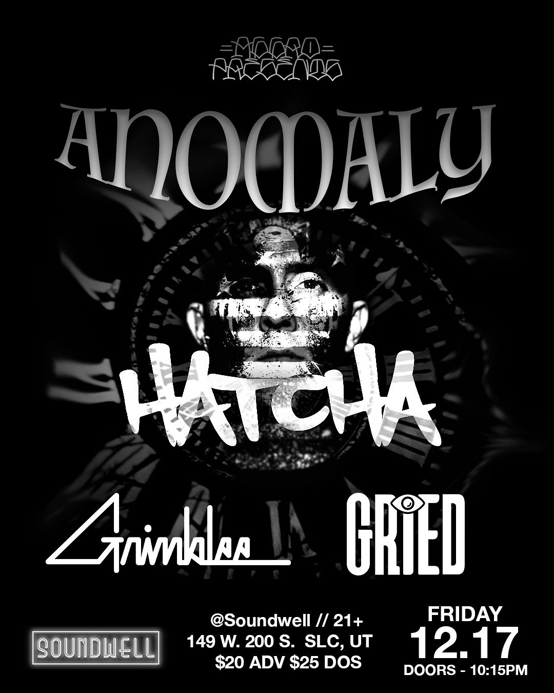 AGGRO Presents Anomaly featuring Hatcha Support: GRIED, GRIMBLEE 10:15PM - 1:30AM 21+ Event Only VENUE LOCATION: Soundwell SLC 149 W 200 S Salt Lake City, Utah 84101 ALL SALES FINAL, NO REFUNDS OR EXCHANGES
