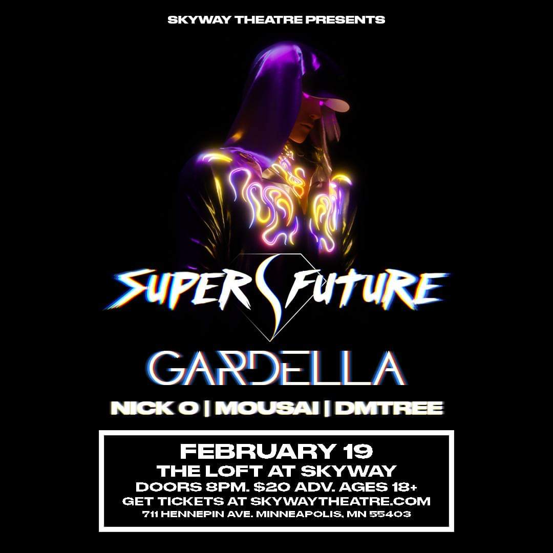 Skyway Theatre Presents Super Future + Gardella Saturday, February 19th @ The Loft at Skyway Theatre Tickets On-sale: Thursday, November 18th @ 10am CST Tickets $20 ADV | Ages 18+ β€ skywaytheatre.com/event/super-future ππππ πππππππ πππππ πππ πππ ππππππππππππ & ππππππππππ: https://bit.ly/3rjqS0z β€ Super Future facebook.com/SuperFutureDJ soundcloud.com/superxfuture twitter.com/SuperFutureDJ instagram.com/superfuturedj β€Gardella facebook.com/GARD3LLA soundcloud.com/gardella twitter.com/gardellaaaa instagram.com/gardellaaa + MORE SUPPORT TBA _________________________________________________ Skyway Theatre | THE LOFT | Studio B | The Lyric | Bar Fly Minneapolis 711 Hennepin Ave, Minneapolis, MN 55403 www.skywaytheatre.com Show Questions? FOLLOW US to hear about our weekly ticket giveaways! β€ fb.com/SkywayTheatre β€ snapchat.com/add/skywaysnap β€ instagram.com/skywaytheatre β€ twitter.com/SkywayTheatre
