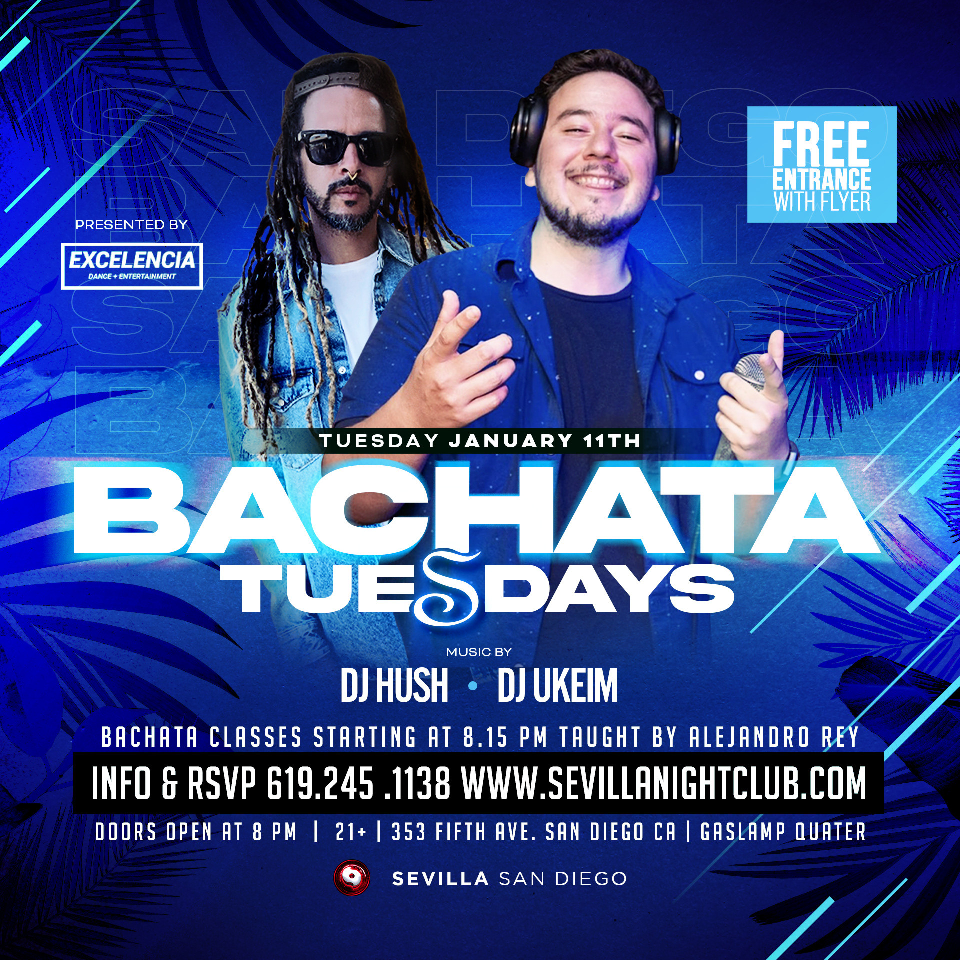 BACHATA NIGHTS HUSH + VICE IN THE MIX FREE ENTRANCE WITH FLYER DOORS OPEN 8 PM BACHATA CLASS PART ONE 8.15PM PART TWO 9.15 NIGHT ENDS 2 AM 353 5TH AVE | GASLAMP QUARTER TAUGHT BY ANIMO DANCE COMPANY