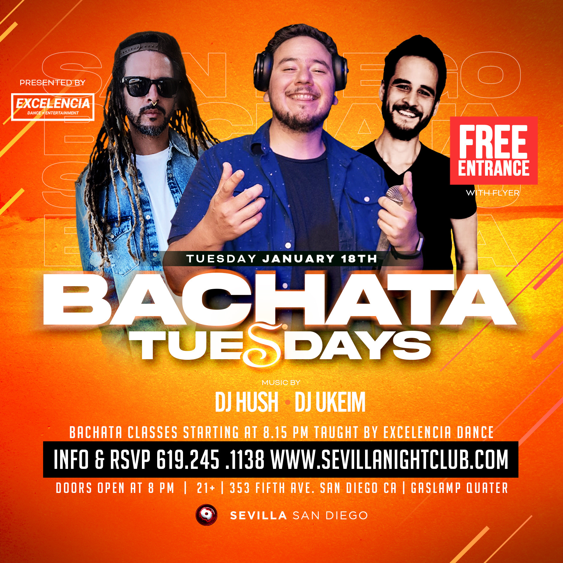 BACHATA NIGHTS HUSH + UKEIM IN THE MIX DOORS OPEN 8 PM BACHATA CLASS PART ONE 8.15PM PART TWO 9.15 NIGHT ENDS 2 AM 353 5TH AVE | GASLAMP QUARTER TAUGHT BY EXCELENCIA DANCE FREE ENTRANCE ON GUESTLIST